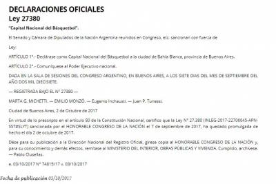 Todo comenzó el pasado 2 de septiembre. Finalmente, el 2 de octubre de 2017 quedó promulgada la ley 27.380 que dice que Bahía Blanca es la Capital Nacional del básquet. Sin dudas un logro que fortalece y reinvindica todo lo realizado en épocas pasadas y presentes por la ciudad y su amistad con la naranja.