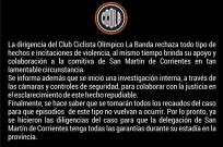 00:49 | El Club Ciclista Olímpico de La Banda emitió esta noche un descargo sobre los incidentes que vivió el plantel de San Martín y las amenazas mientras entrenaban en su estadio.